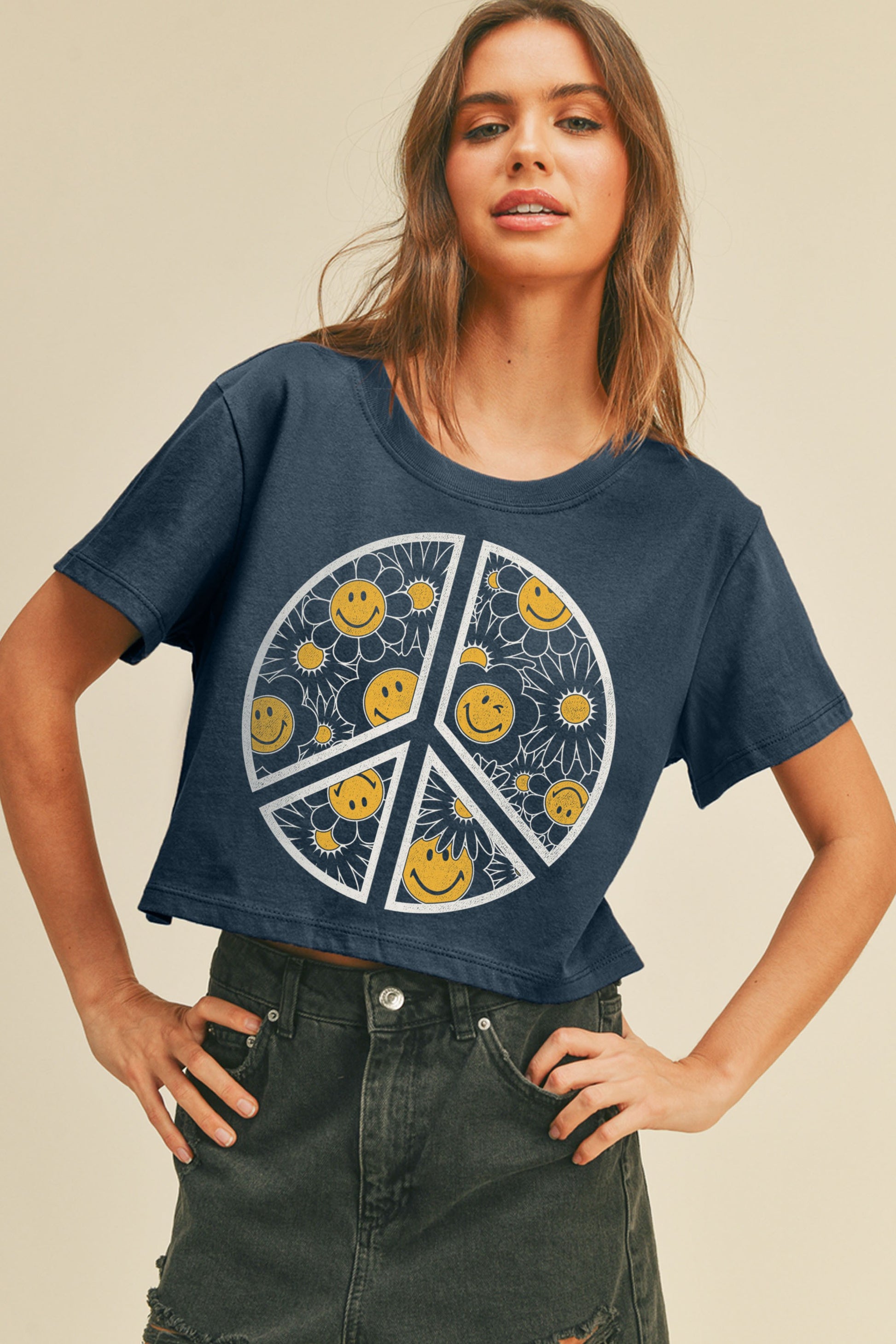 Elevate your casual style with our Happy Face Flower Peace Sign Graphic Short Crop Tee. Made from 100% cotton, this soft and comfortable tee features a vibrant graphic design that combines a happy face, flower, and peace sign, perfect for adding a touch of positivity to any outfit.